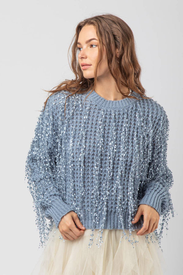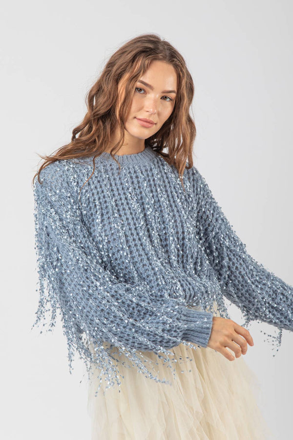 LONG SLEEVE ROUND NECK SWEATER WITH SEQUIN FRINGE DETAILS