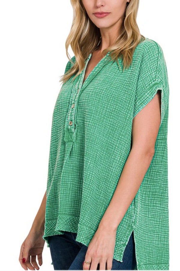 SHORT SLEEVE DOUBLE GAUZE HENLEY WITH HILO HEM