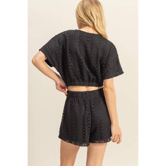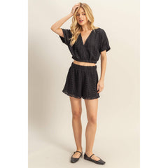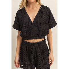 CROCHET VNECK FAUX WRAP TOP WITH ELASTIC HEM