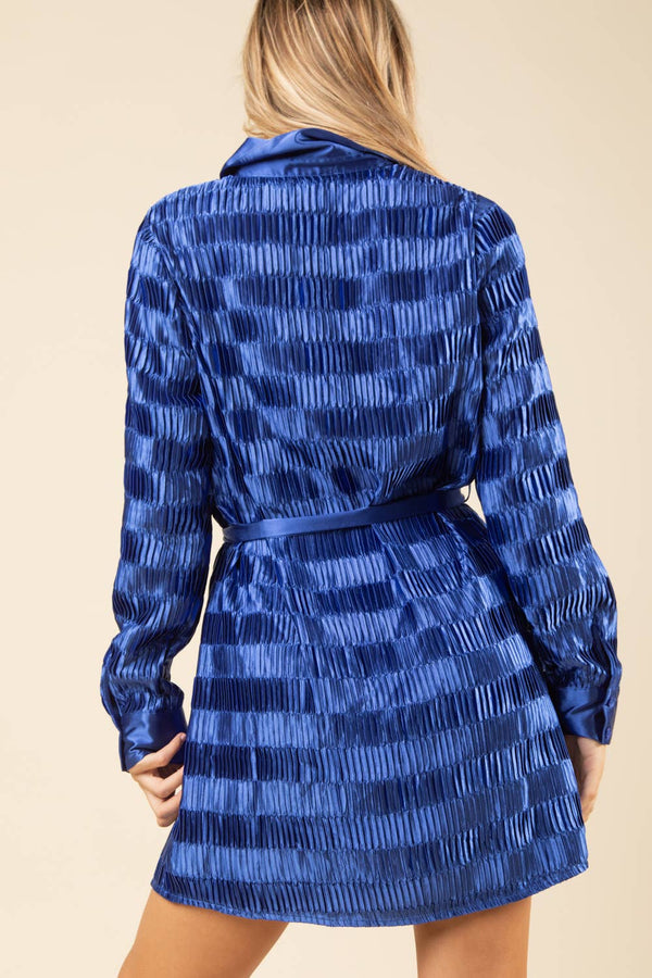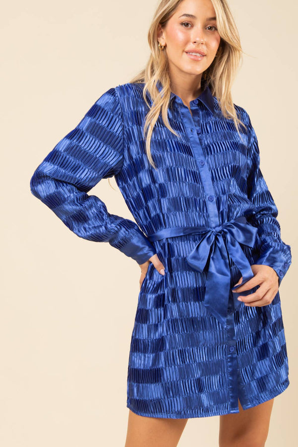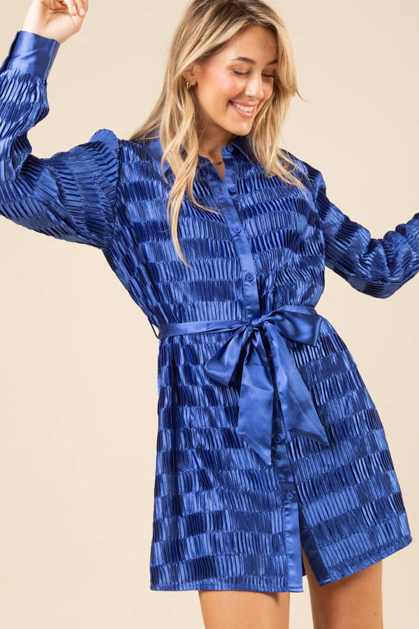 Shiny Satin Pleated Holiday Party Shirt Mini Dress - Long Sleeve - Button Down - W/ Waist Tie - Round Hem