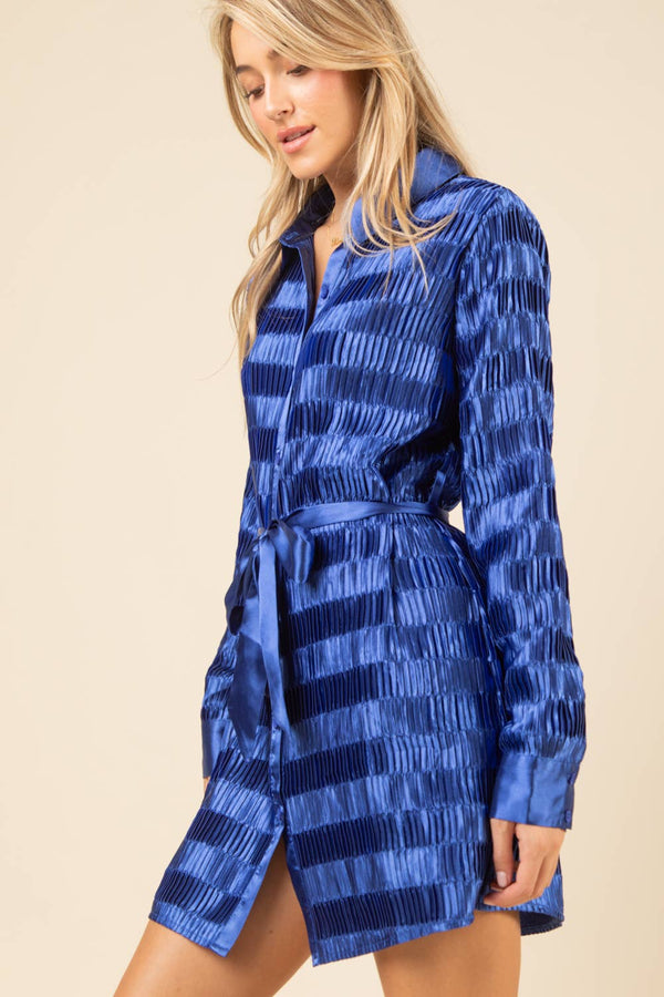 LONG SLEEVE SATIN PLEATED BUTTON DOWN BELTED DRESS