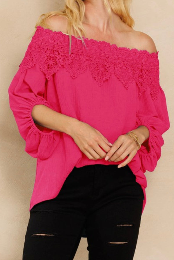 OFF THE SHOULDER CROCHET TRIM 3/4 SLEEVE WOVEN TOP