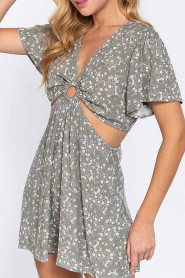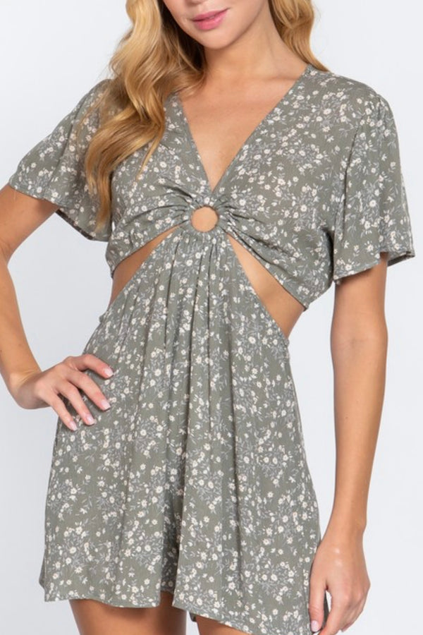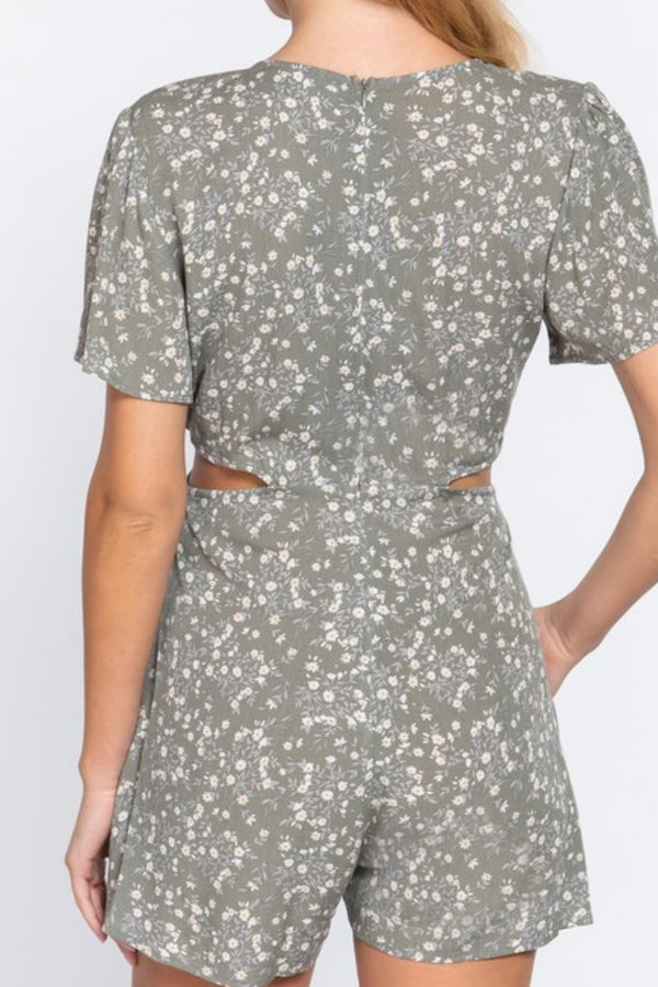 SHORT RUFFLE SLEEVE V-NECK WITH O-RING CUT OUT BACK ZIPPER ROMPER