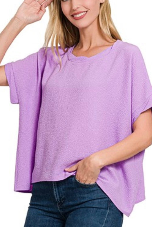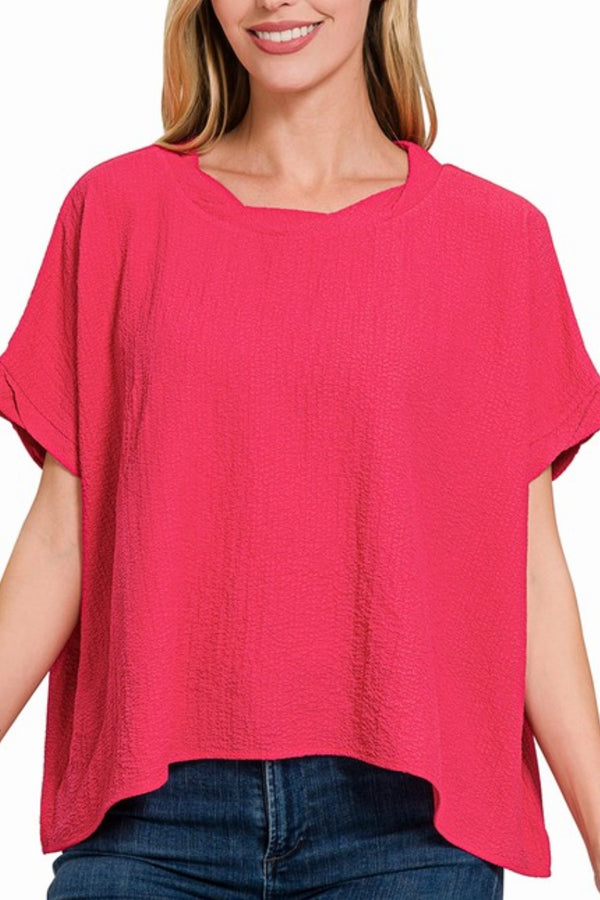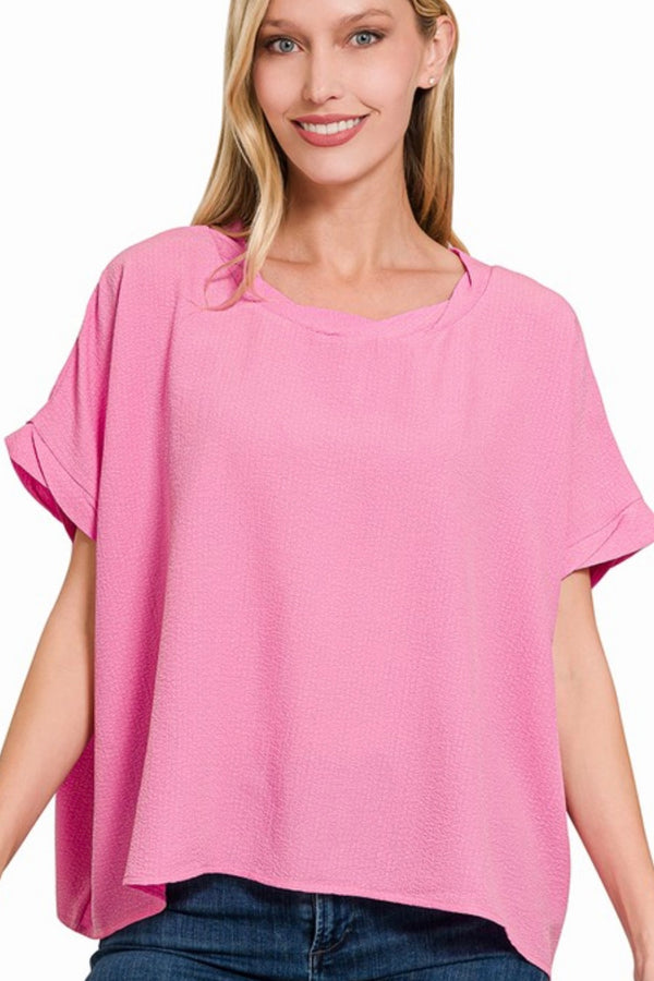SHORT SLEEVE FLOWY TOP WITH TWIST HEM DETAIL